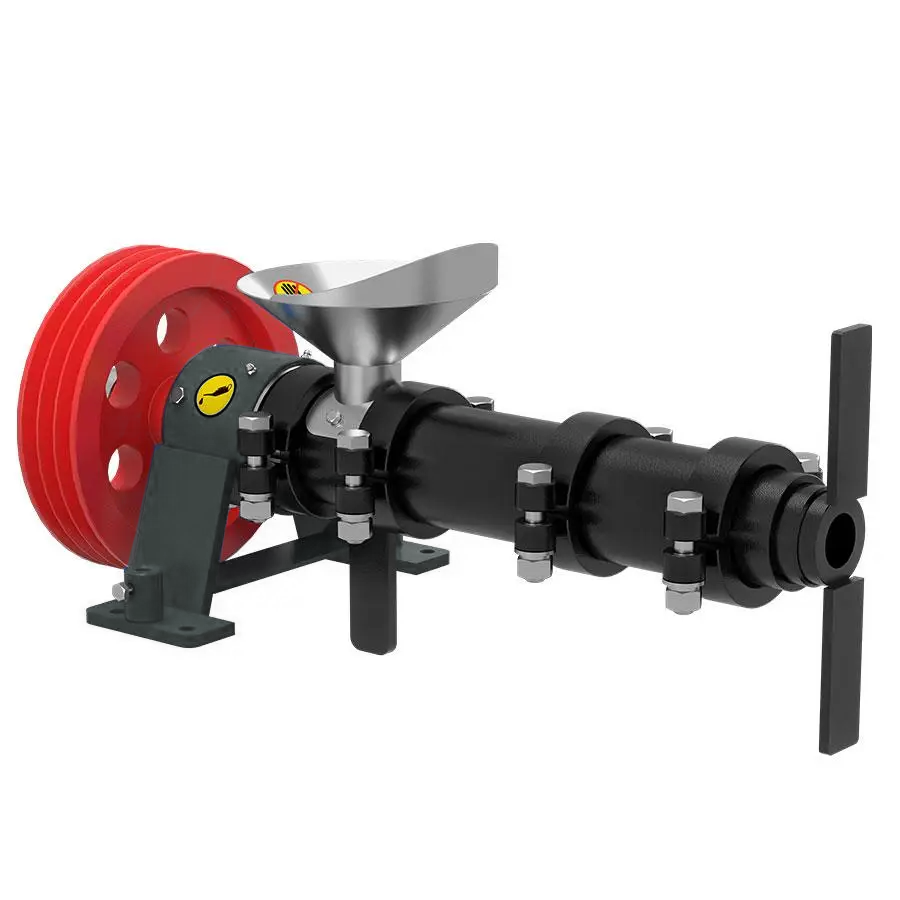 Część robocza ekstrudera EGK-150/200 to kompletna jednostka wytłaczająca z komorą, ślimakiem, tulejami hartowanymi, głowicą, wałem oraz kołami pasowymi.