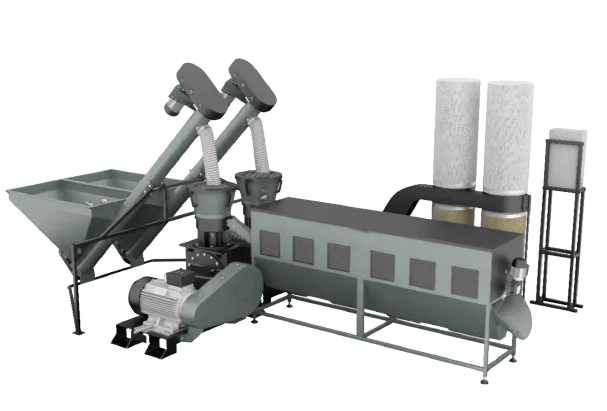 • Dwie niezawodne peleciarki PELETON-300: jedna peleciarka o wydajności do 350 kg/h przy produkcji peletu oraz do 700-800 kg/h przy produkcji paszy z łatwością poradzi sobie z różnymi rodzajami surowców. Klient ma możliwość zamontowania silników o mocach 22kW oraz 30 kW. Moc silników jest dostosowywana do przerabianego surowca. Dla przerabiana miękkich surowców oraz paszy jest montowany silnik 30kW, natomiast przy przerabianiu trocin oraz biomasy na pelet zalecamy silnik 22kW.