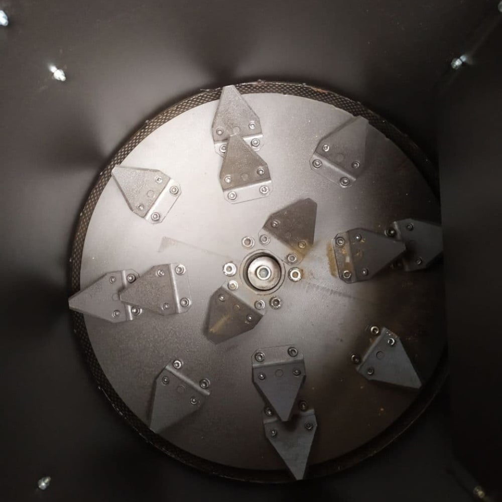 W naszym rozdrabniaczu zastosowano innowacyjne rozwiązanie do mielenia surowca, jakim jest koło zamachowe o wadzę 55 kg oraz specjalne noże. Dzięki tym rozwiązaniom udało się nam osiągnąć wysoką produktywność przy relatywnie niskim zużyciu energii. Rozdrabniacz jest w stanie przerabiać słomę do 25% wilgotności.